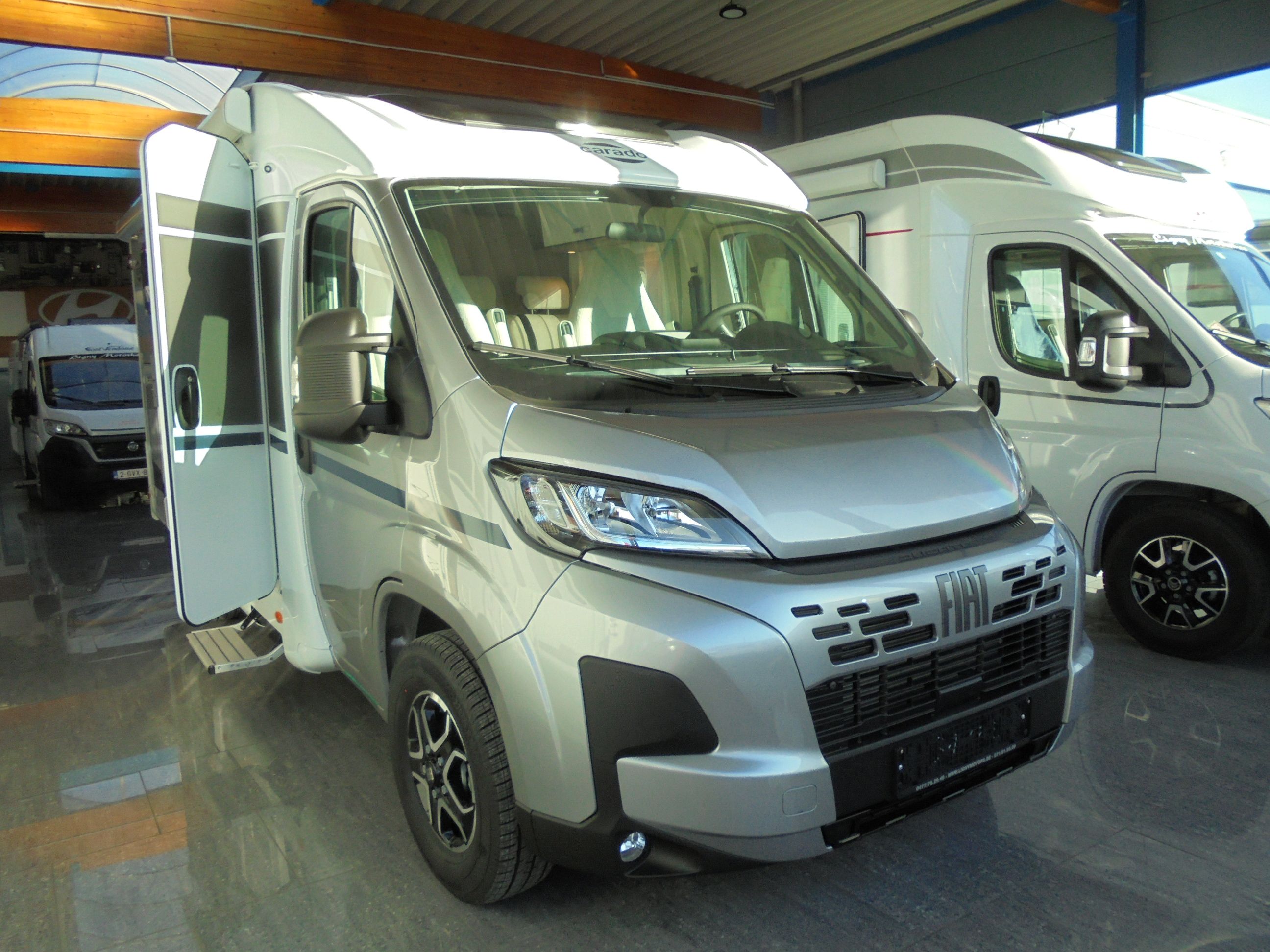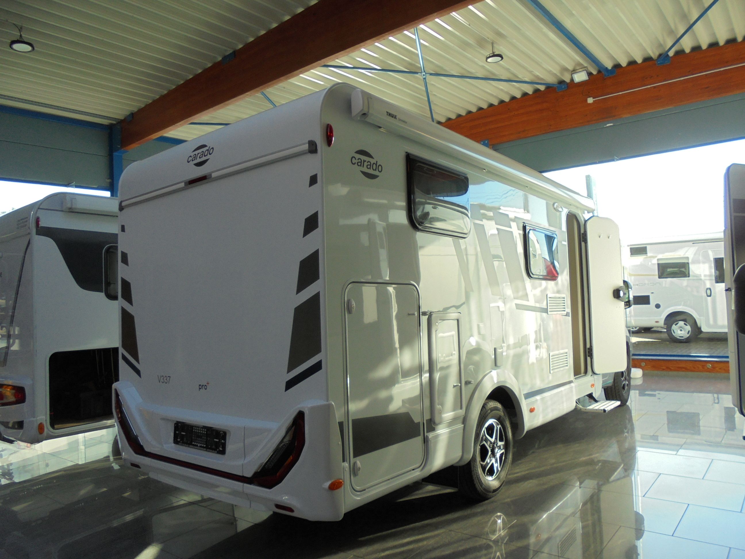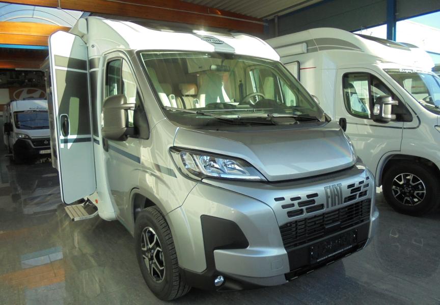 New camping-car CARADO V 337 PRO+, porteur Fiat de 140 CV, boîte automatique 8 rapports, réservoir carburant 90 litres , capteurs pression des pneus, frein de parking électrique, chauffage Combi 6E ( avec résistance électrique ) panneau de commande digital, préparation télé, coussin supplémentaire pour maxi couchage.